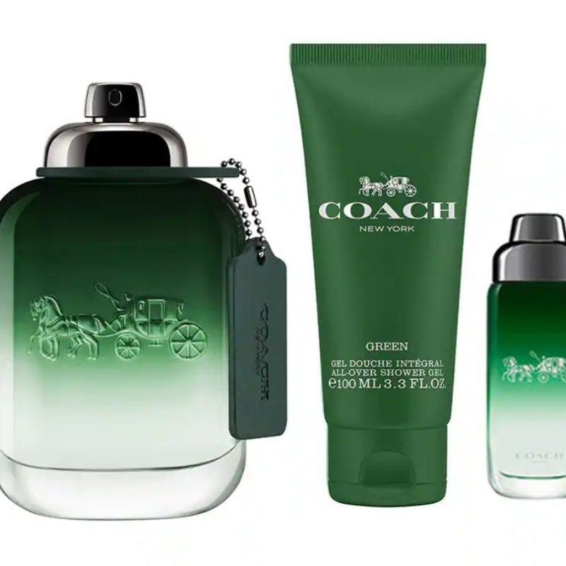 1 fragancia 100 ml, 1 perfumero 10 ml y 1 gel para ducha 100 ml. Coach Green es una fragancia fresca, aromática, herbal y amaderada. El aroma de apertura es cítrico y fresco